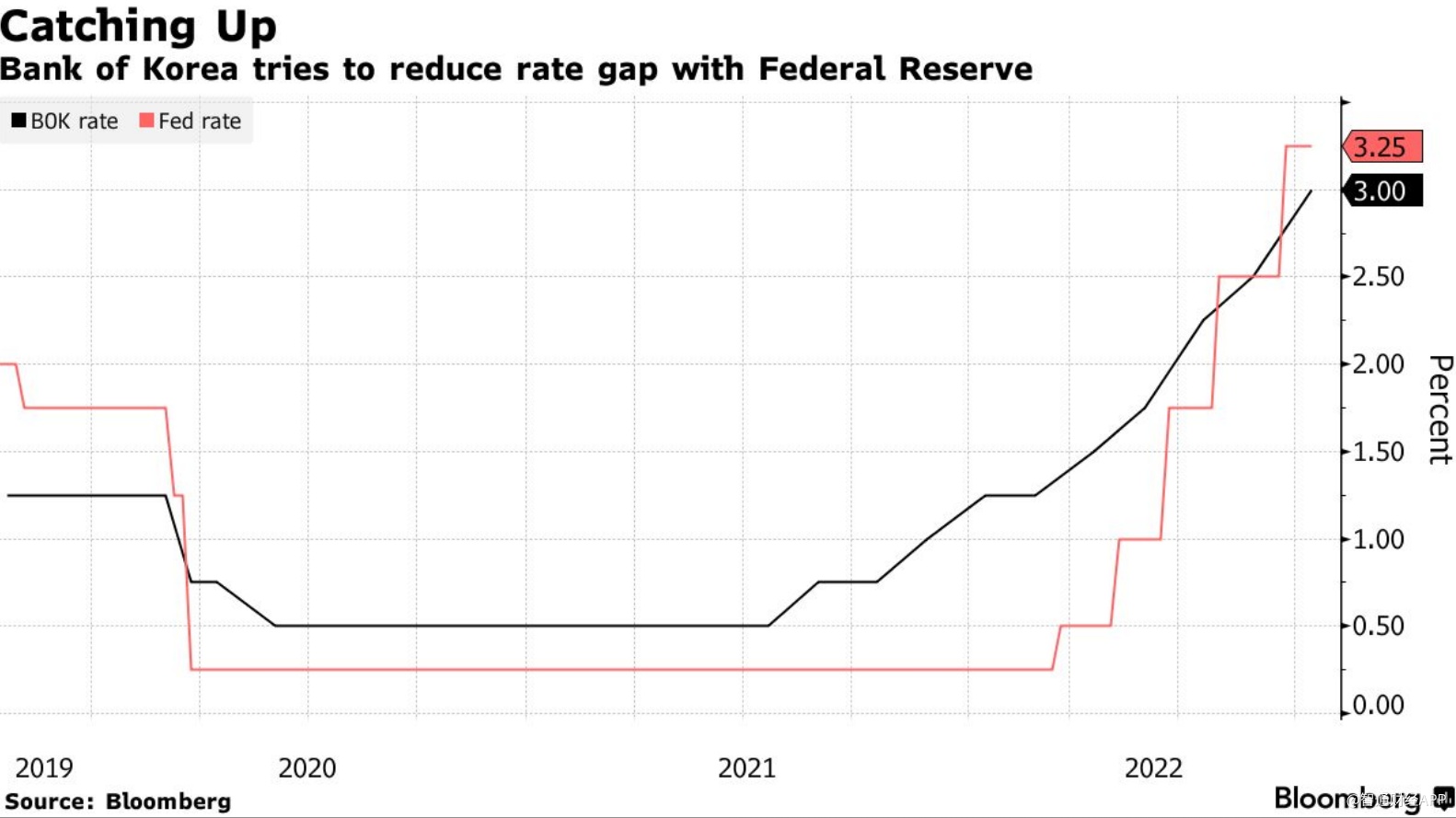韩国央行是最新一家对美联储大幅加息以抑制通胀做出回应的央行。韩国央行在7月份已经将利率上调了50个基点,随后在8月份将加息幅度降至25个基点。