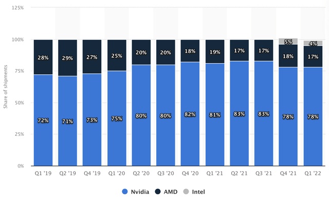 英伟达仍然控制着近80%的独立显卡市场。尽管英特尔(INTC.US)最近进入了高端显卡市场,但英伟达很可能仍将是这一领域的主导企业。英伟达的显卡仍然是业界的黄金标准,这一点可能不会很快改变。