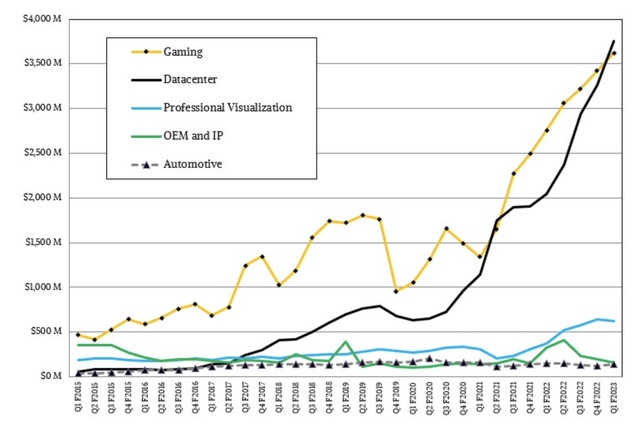 英伟达的游戏业务部门应该会在经济放缓之后反弹,使游戏业务营收恢复并再次增长。此外,该公司的数据中心业务持续蓬勃发展,在人工智能、汽车和其他次要领域也有发展前景。