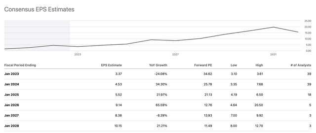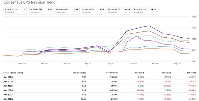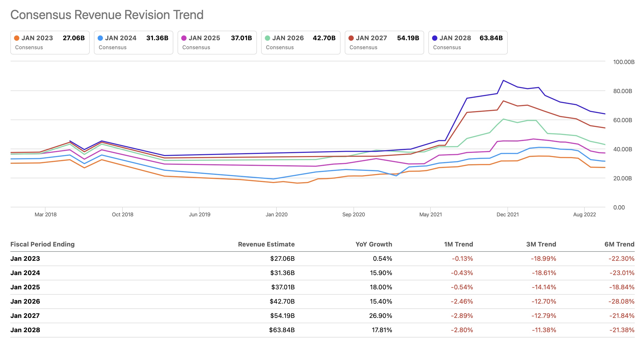 由于游戏业务营收下降、市场整体走弱和其他因素,近几个月来,英伟达的营收和盈利预期被大幅下调。数据显示,在过去六个月里,市场对英伟达未来几年营收的普遍预期下降了约20%,对未来几年每股收益的普遍预期下降了20-40%。