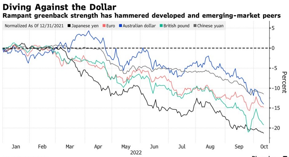 在美联储强硬政策、美国经济相对强劲和避险需求的推动下,美元兑日元等货币创下数十年高点,同时将印度卢比、欧元和英镑等推至创纪录低点。