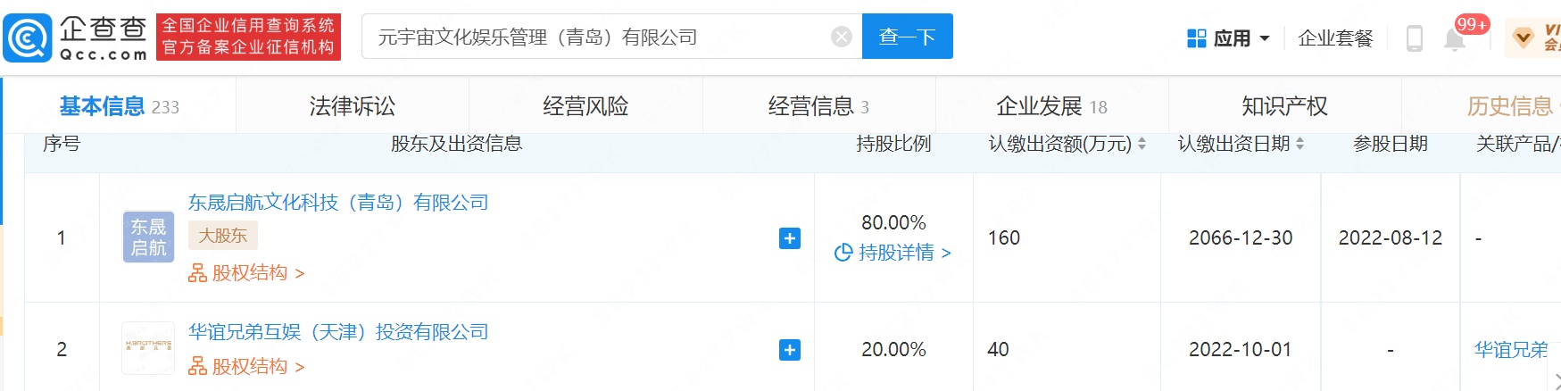 智通财经APP获悉,企查查APP显示,近日,元宇宙文化娱乐管理(青岛)有限公司(下称:元宇宙文化娱乐)发生工商变更,新增华谊兄弟(300027.SZ)互娱(天津)投资有限公司成为公司股东,持股比例20%,新增王忠磊担任公司董事。
