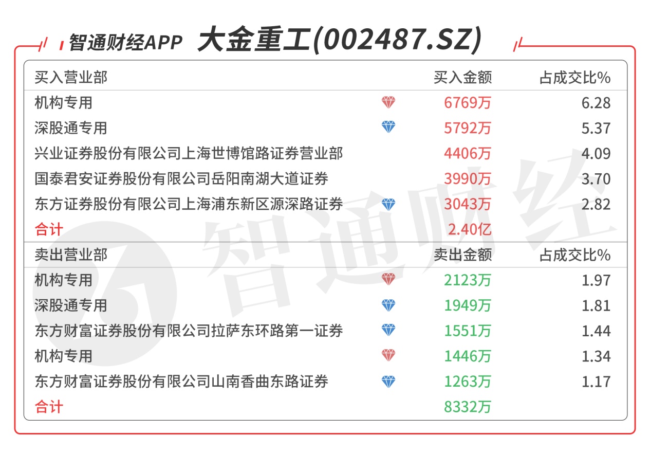 大金重工(002487.SZ):龙虎榜阵容豪华,机构席位对倒净买入3199万元,深股通对倒净买入3843万元,买五是知名游资的席位买入3033万元,当日净买入1.65亿元,该股要突破60日线,成交量需进一步放大。
