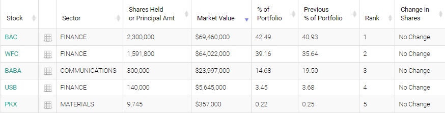 美国合众银行(USB.US)、浦项钢铁(PKX.US)分别位列第四、第五,持仓市值分别为564.5万美元、35.7万美元。