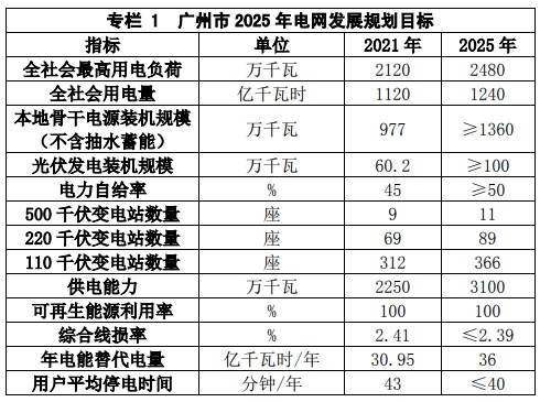 2022-2025年,广州110千伏及以上变电站新增76座,达到466座。到2025年,投产藏东南至粤港澳大湾区±800千伏特高压直流输电工程及配套工程等关键网架完善工程,力争全市供电能力达3100万千瓦,保底电网重点项目建成率100%。全面建设数字配电网,集中式自愈覆盖率100%,全市用户平均停电时间不超过40分钟/年、城区不超过30分钟/年。