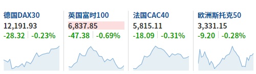 2. 截至发稿,德国DAX指数跌0.23%,英国富时100指数跌0.69%,法国CAC40指数跌0.31%,欧洲斯托克50指数跌0.28%。