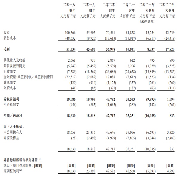 于2019财年、2020财年及2021财年,公司的收益分别约为5560.5万、7056.1万、8185.8万元人民币;公司的纯利约为1881.8万、4271.7万、3325.1万元人民币。