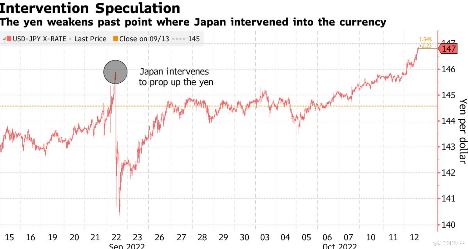 在黑田东彦周三发表讲话后,日元兑美元汇率迅速跌至146.86,汇率跌破了此前促使日本在9月动用近200亿美元买入日元的145.90,这也是1998年以来日本首次干预汇市以支撑日元。