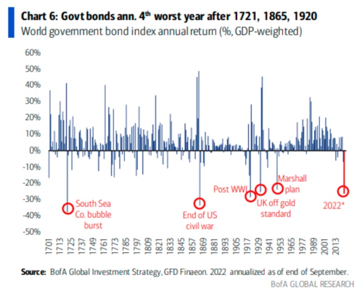 因此,要扭转全球国债收益率的爆炸式增长和空前上升,人们需要看到的是一波国内政府以外的主权债券边际购买浪潮。否则,债券价格将会继续下挫(利率继续上升),直至债券被视为一种具有吸引力的投资和配置(如下图所示,国债市场即将迎来历史上回报率最差的年份之一)。