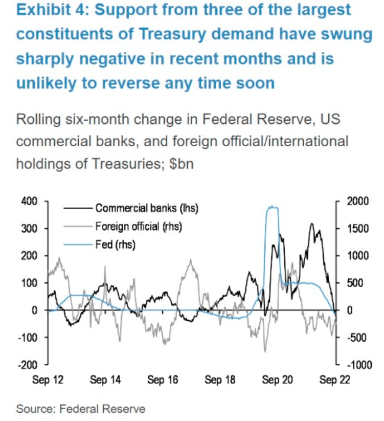 随着全球各大央行继续努力缩减资产负债表,各国对主权债券的需求都在下降。事实上,英国央行本周被迫购买更多债券,这种持续扩大购债范围的举措清楚地表明,目前央行是(也必须是)唯一的边际买家。