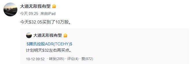 段永平昨日在社交平台再次发声,计划今日32美元左右再买入腾讯ADR,今日更新动态,以32.05美元买入10万股腾讯ADR,耗资约2500万港元。这已经是段永平今年来第五次抄底腾讯,最早公布的是2月份,段永平以53.5美元的价格购买了10万股腾讯ADR。