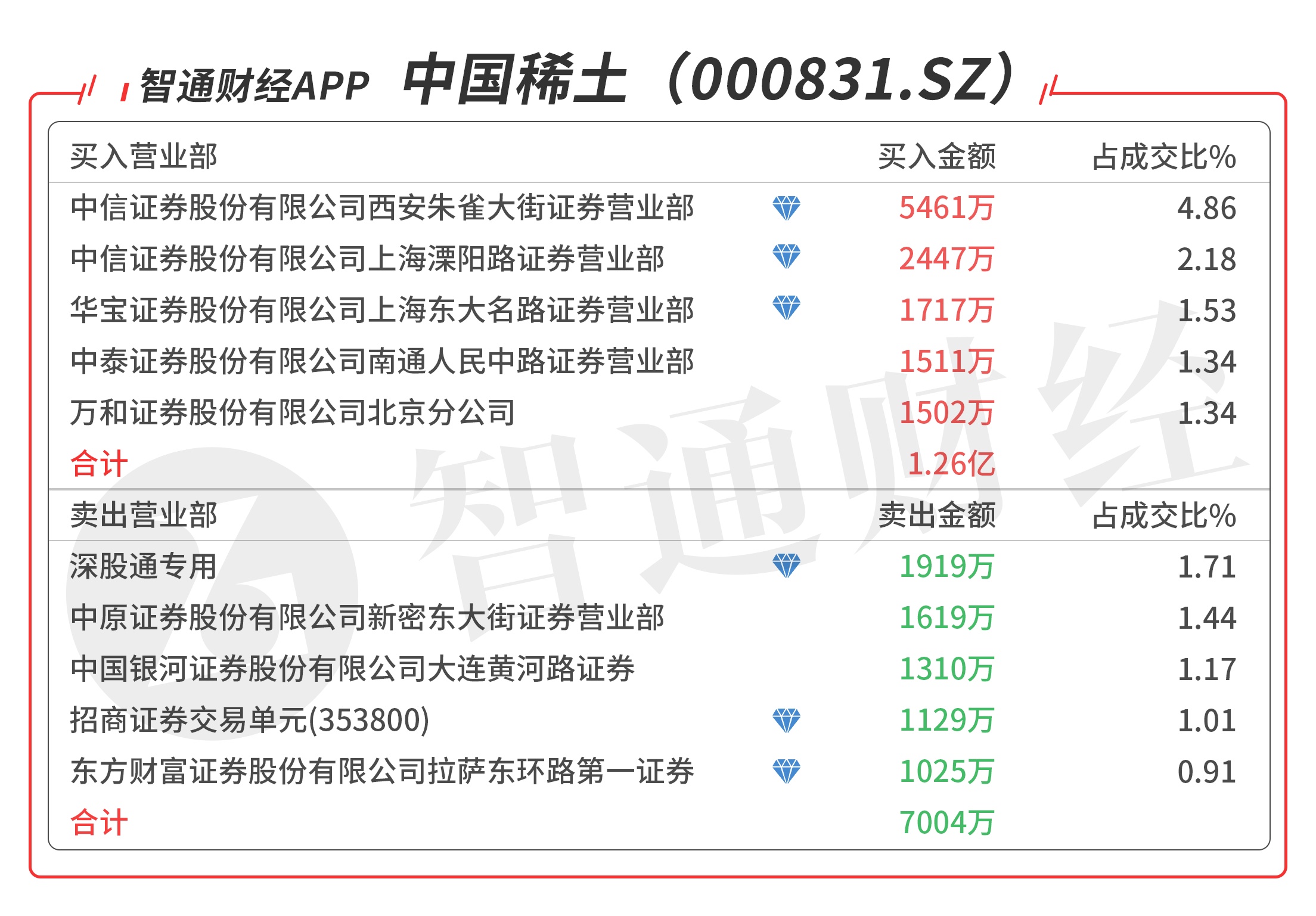 中国稀土(000831.SZ):龙虎榜阵容豪华,深股通对倒净卖出574万元,买一是顶级游资方新侠的席位买入5461万元,买二是顶级游资孙哥的席位买入2434万元,买三是知名游资的席位买入1617万元,当日净买入7950万元,该股今日突破所有均线,预计有溢价。
