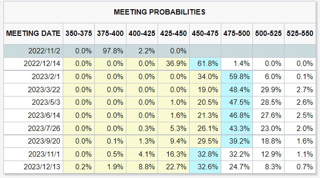 继上周公布强劲的就业报告之后,CPI报告可能会巩固美联储在11月政策会议上再加息75个基点的这一潜在决定。另外,市场对于本轮加息周期利率峰值的预期有所升温,在数据公布之后,市场对于联邦基金利率的预期数据显示,明年三月终端利率达到4.75%-5%区间的可能性越来越大,高于FOMC点阵图显示的中值4.6%。