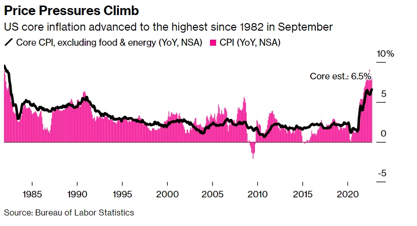 美国劳工部周四公布的最新数据显示,不包括食品和能源的核心消费者价格指数(CPI)较上年同期增长6.6%,创下自1982年以来的最高水平。8月的核心CPI数据环比增长0.6%,9月数据则环比增长0.5%。核心CPI的同比和环比基准数据均超市场预期(6.5%和0.4%)。