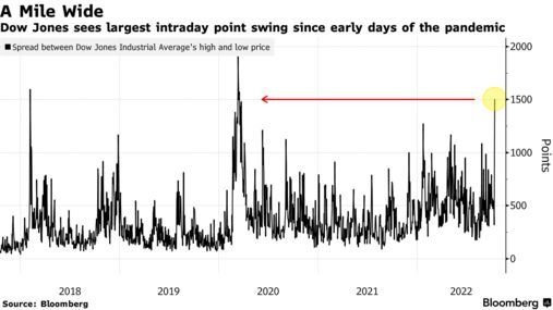 根据彭博社1990年以来的数据,美股从未在一天内经历过如此极端的变动。与此同时,道指从当天的低点飙升了约1400点。