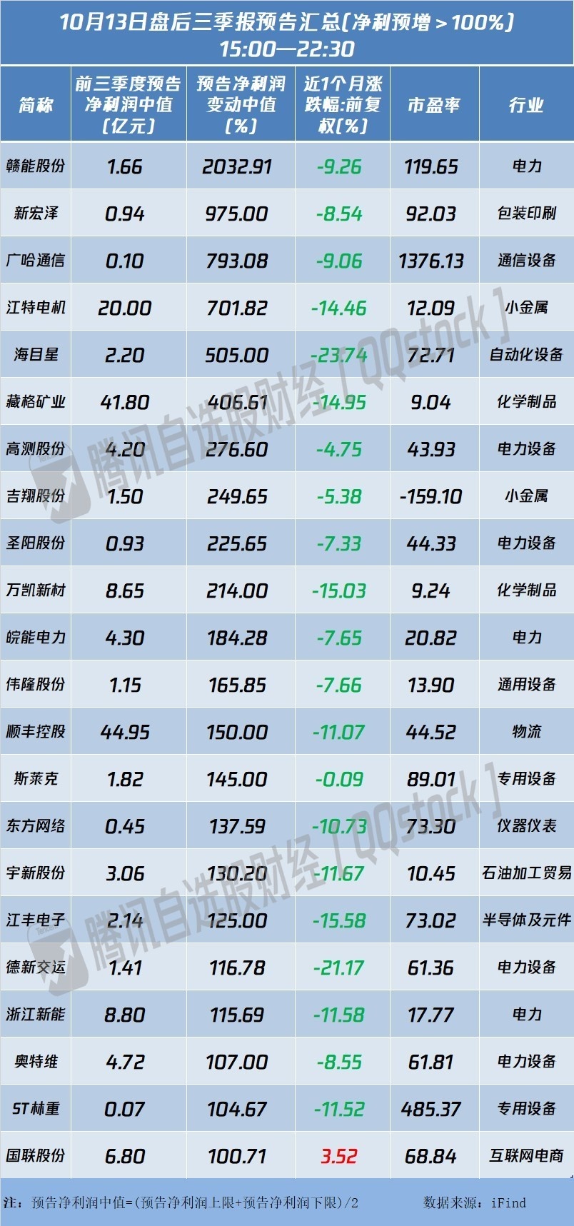 据iFind数据,周四盘后(15:30-22:30),已有超过40家上市公司披露前三季度业绩预告。其中,超过20家上市公司业绩净利预增超100%。赣能股份、新宏泽、广哈通信前三季度净利增幅位居前三,分别为2032.91%,975%,793.08%。