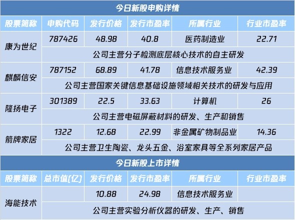 自选哥提示,今日康为世纪、麒麟信安、隆扬电子、箭牌家居4只新股申购,海能技术上市。