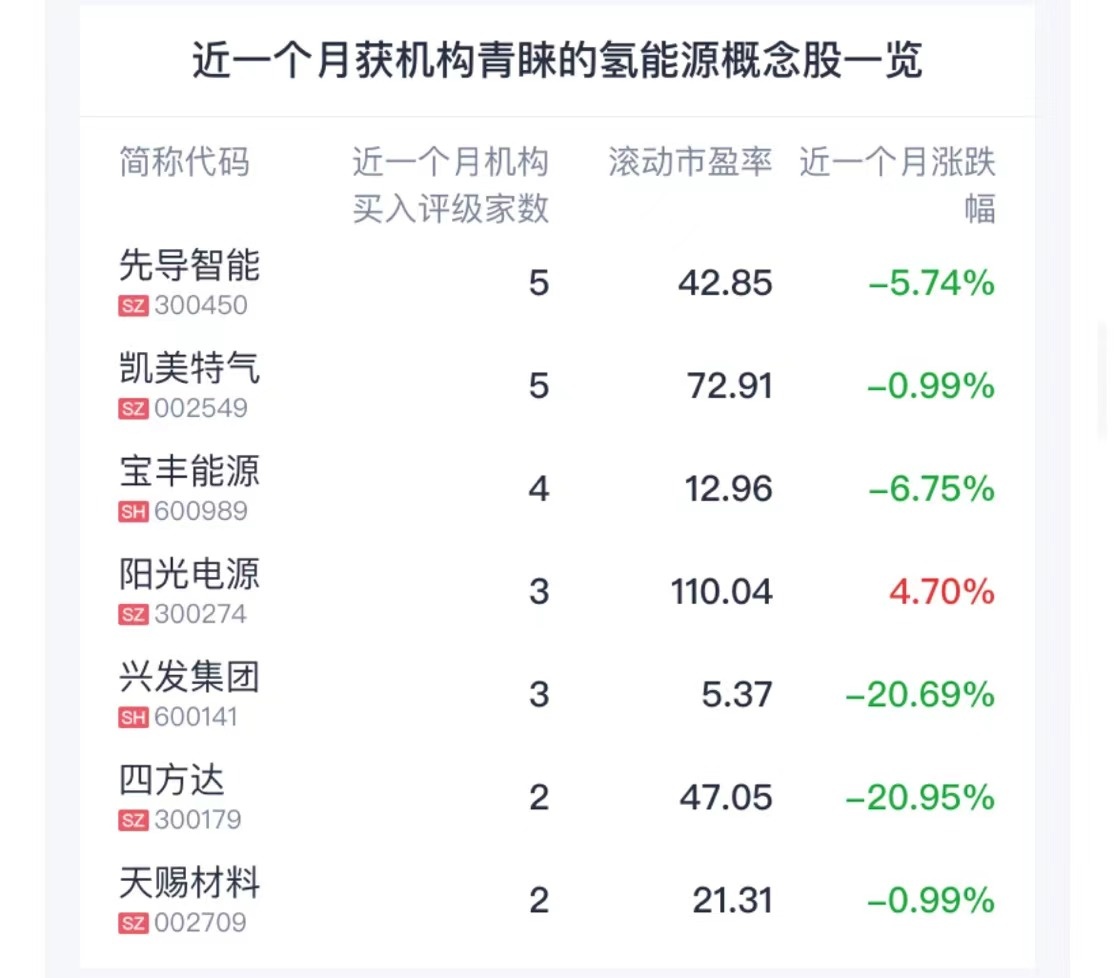 腾讯自选股梳理发现,A股氢能源概念股中近一个月获机构买入评级大于1家的有7只,其中先导智能、凯美特气、宝丰能源等家数较为领先,分别为5、5、4家。