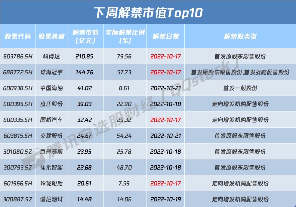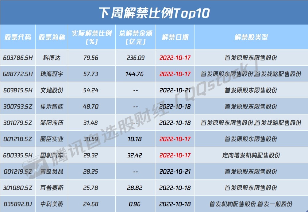 从解禁比例来看,下周科博达解禁比例达79.56%,其次解禁比例居前的分别为珠海冠宇和交建股份;从解禁市值来看,科博达、珠海冠宇、中国海油等股解禁市值居前。