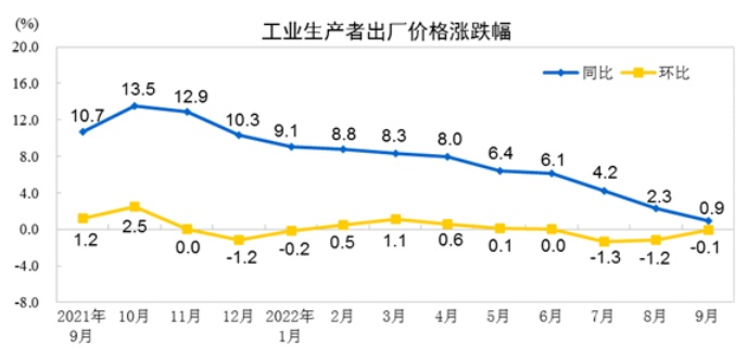 智通财经APP获悉,10月14日,国家统计局发布了2022年9月份全国PPI(工业生产者出厂价格指数)数据。2022年9月份,全国工业生产者出厂价格同比上涨0.9%,环比下降0.1%;工业生产者购进价格同比上涨2.6%,环比下降0.5%。1—9月平均,工业生产者出厂价格比去年同期上涨5.9%,工业生产者购进价格上涨8.3%。