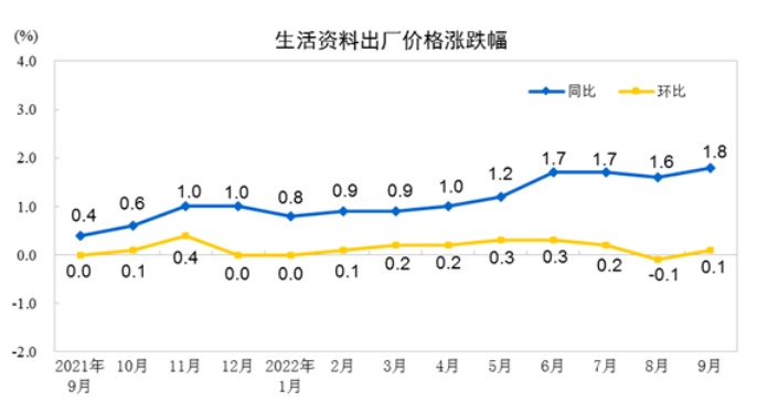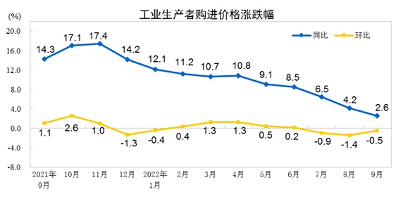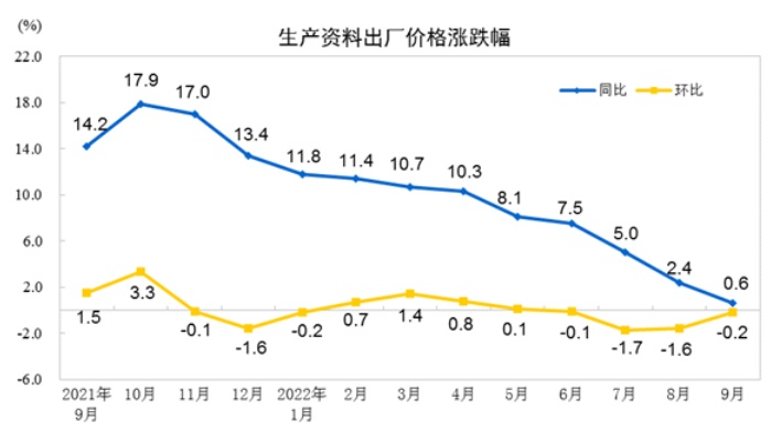 2022年9月份,全国工业生产者出厂价格同比上涨0.9%,环比下降0.1%;工业生产者购进价格同比上涨2.6%,环比下降0.5%。1—9月平均,工业生产者出厂价格比去年同期上涨5.9%,工业生产者购进价格上涨8.3%。
