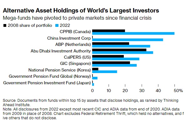 根据一份投资文件的分析显示,自全球金融危机以来,在非公开市场披露持股情况的十大全球基金在私人股本和信贷、房地产、基础设施和对冲基金等资产中的总权重增加了一倍,达到其投资组合的四分之一左右。