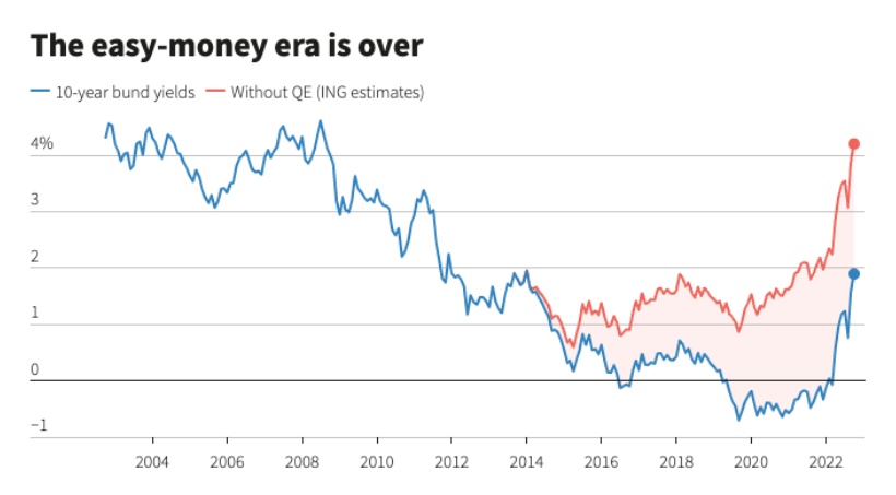 欧洲央行在过去十年购买了5万亿欧元(4.9万亿美元)的债券以拉高通胀,现在却发现自己在与创纪录的10%的通胀率作斗争。该行行长拉加德本周承认,关于量化紧缩(QT)的讨论已经开始,并将继续下去。
