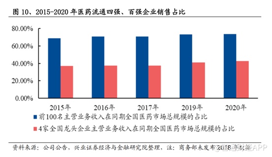在上述背景下,行业集中度近年来不断提升。2020年,根据商务部发布的药品流通行业运行统计分析报告,药品批发企业主营业务收入前100 位占同期全国医药市场总规模的 73.7%,同比提高0.40百分点。其中,4家全国龙头企业主营业务 收入占同期全国医药市场总规模的42.6%,同比提高1.60百分点,呈现出集中度日益提高的特点,而且前100位企业里最后一位的企业收入还有所下降,市场进一步向龙头企业集中。