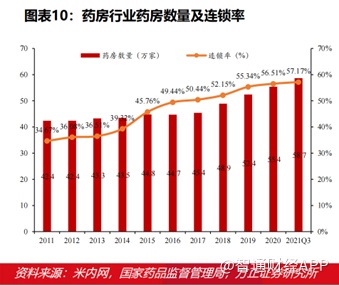 再看药店方面,随着处方外流及分级诊疗政策加速推进,促进药品市场由院内向院外转移,单体药店面对强监管成本过高,逐步退出市场。而连锁药房通过精细化管理,统筹门店配置,设置中央仓等方式,进一步优化成本,实现规模效应。根据米内网数据显示,截至2021Q3,全国共有零售药房58.7万家,连锁率达57.17%。