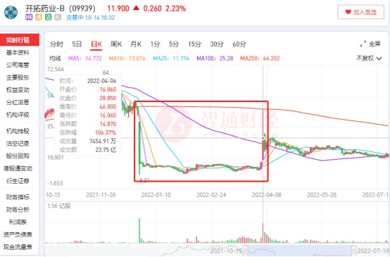 尔后三个多月,开拓药业股价一路低位横盘。直到4月6日,公司盘中股价一度涨至46港元,最高涨幅达到229.04%。
