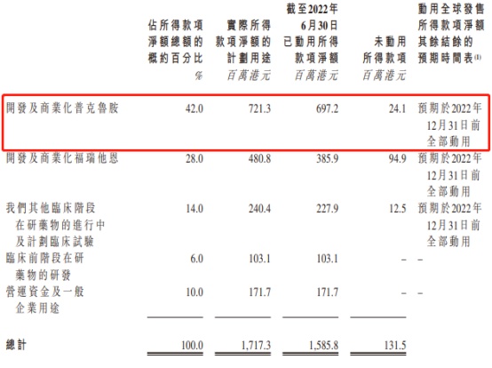 中报显示,截至今年6月底,开拓药业的港股IPO所得款项中,用于普克鲁胺开发及商业化的款项已动用6.97亿港元,占实际所得款项的96.66%,并且该款项将在今年年末前全部动用。