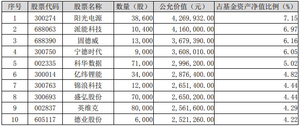 华富科技动能前十大重仓股分别为阳光电源、派能科技、固德威、宁德时代、科华数据、亿纬锂能、锦浪科技、盛弘股份、英维克、德业股份,主要涵盖等光伏设备、电池等领域个股,十大重仓股占基金净值比合计53.56%。