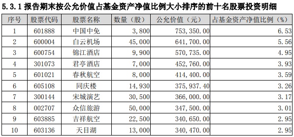 华富灵活配置混合前十大重仓股分别为中国中免、白云机场、集锦酒店、君亭酒店、春秋航空、同庆楼、宋城演艺、众信旅游、吉祥航空、天目湖等,主要涵盖航空机场、酒店餐饮旅游及景区领域个股,十大重仓股占基金净值比合计39.9%。