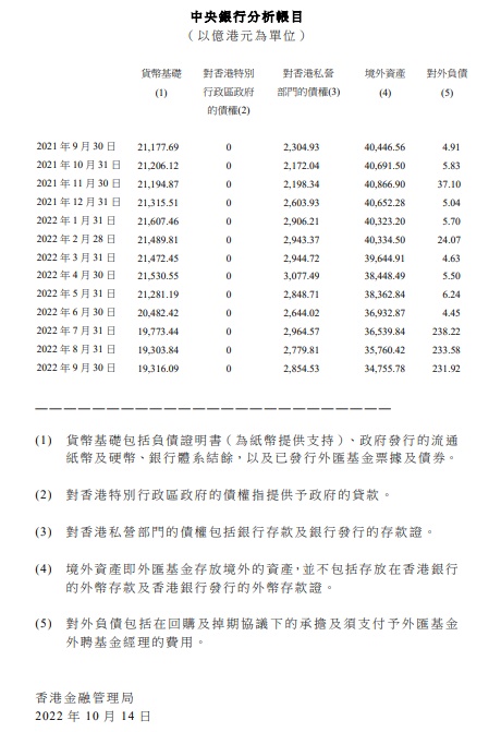 货币基础为19316亿港元,包括负债证明书、政府发行的流通纸币及硬币、银行体系结余,以及已发行外汇基金票据及债券。外汇基金对香港私营部门的债权总额为2855亿港元。