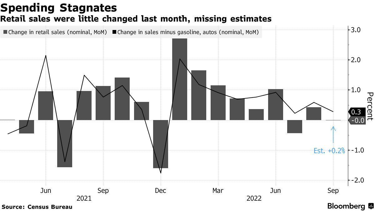 智通财经APP获悉,美国上月零售销售数据停滞不前,表明在数十年来最严重的通胀环境之下,消费者对非必需品的购买变得愈发谨慎。美国商务部周五公布的数据显示,美国9月份零售销售额基本上没有变化,8月份数据向上修正后环比增长0.4%。扣除汽油的零售销售增长0.1%,不过目前这些数据未经通货膨胀因素调整。经济学家普遍预计零售销售增幅为0.2%。