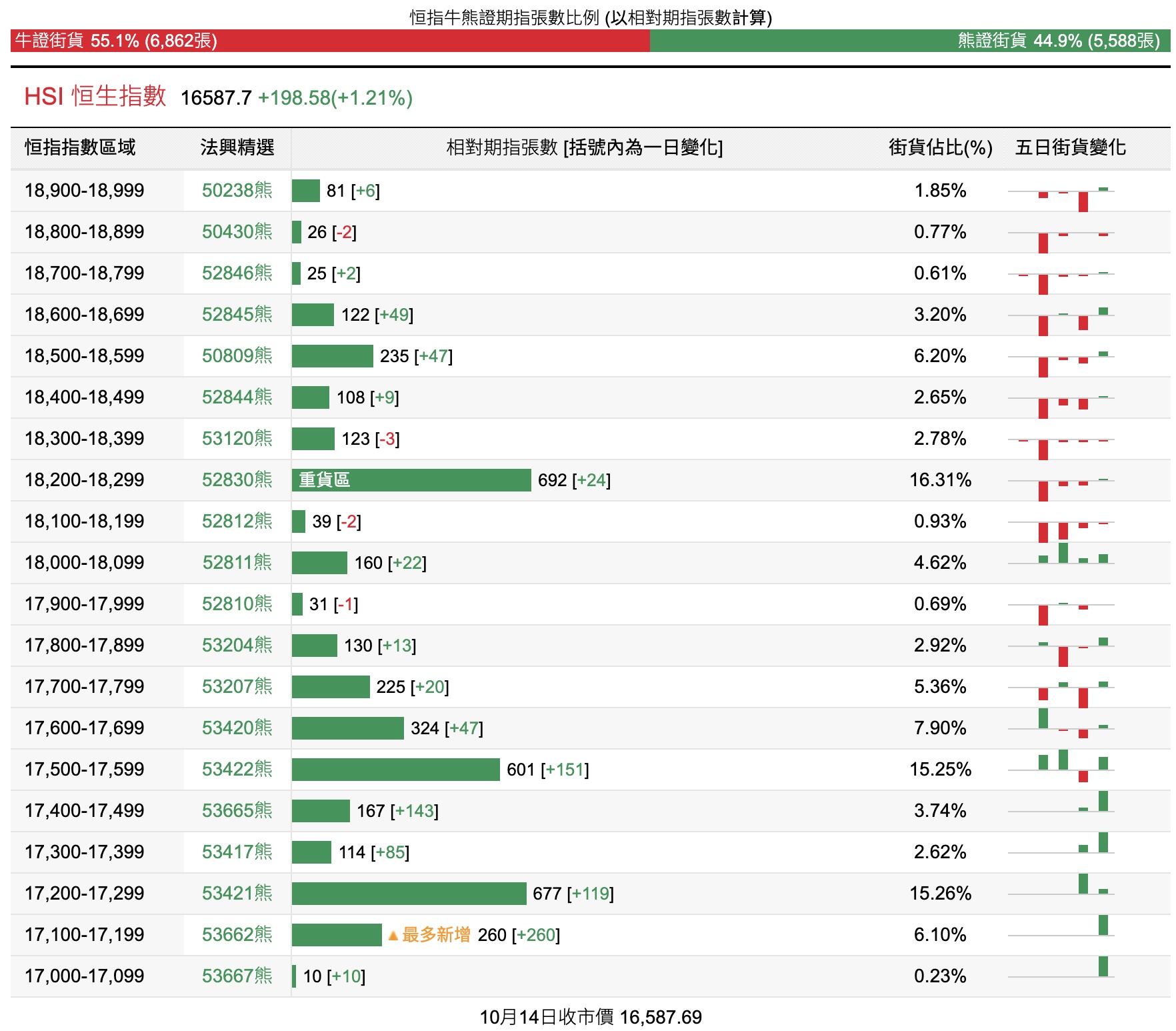 法兴恒指牛熊证街货分布图中的数据显示,熊证街货重货区在18200-18299区间,该区间最新熊证数量为692张,较上一交易日增加24张;最多新增在17100-17199区间,该区间最新熊证数量为260张,较上一交易日增加260张。