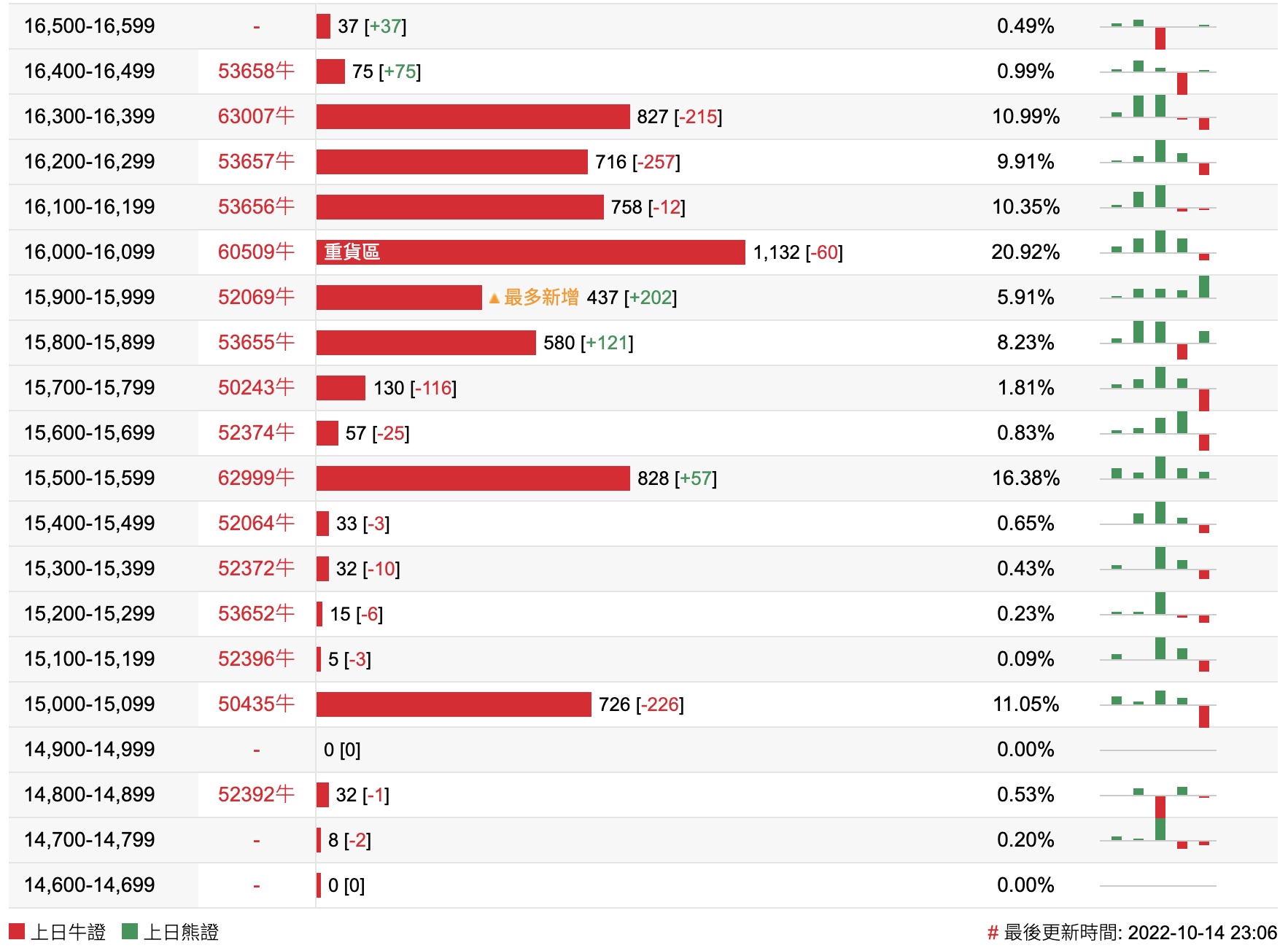 牛证街货重货区在16000-16099区间,该区间最新牛证数量为1132张,较上一交易日减少60张;最多新增在15900-15999区间,该区间最新牛证数量为437张,较上一交易日增加202张。