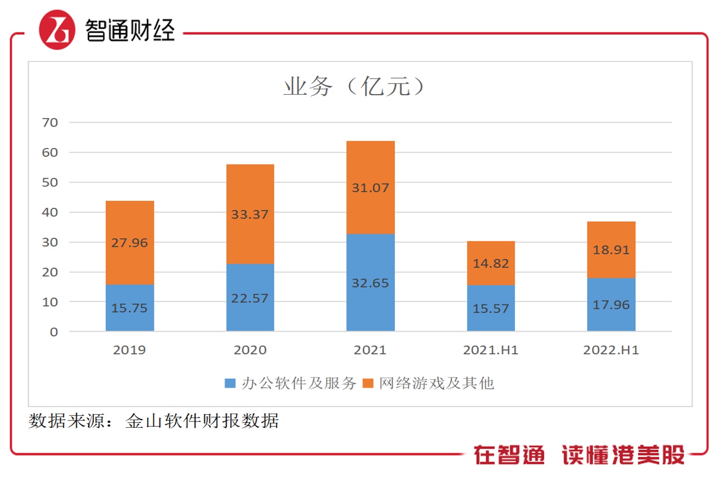 2019-2021年,该公司收入复合增速为20.73%,其中办公软件及服务复合增速43.98%,网络游戏及其他业务复合增速5.41%。办公软件及服务是该公司业绩成长的核心驱动,2021年收入份额超游戏业务。2022年上半年,办公业务保持双位数增长,而游戏业务因新产品上线实现同比增长28%。