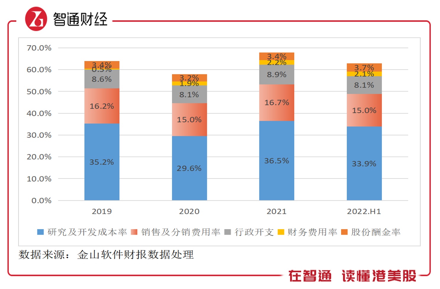 下面我们逐一“排雷”,首先从运营费用上看,包括研发、期间费用(销售、财务及行政费用)整体而言相对稳定,研发费用率最高,稳定在35%左右的水平(2020年值偏低),销售费用率在15%左右,行政费用率在8-9%,财务费用率在2%左右。此外,该公司为激励管理层及骨干,每年都有股份酬金,占比收入在3-4%左右。