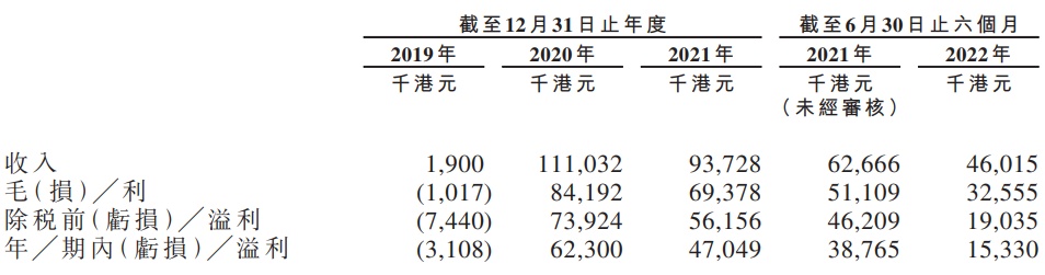 财务方面,于2019年、2020年及2021年以及截至2021年及2022年6月30日止6个月,公司收入分别约为190万港元、1.11亿港元、9372.8万港元以及4601.5万港元。
