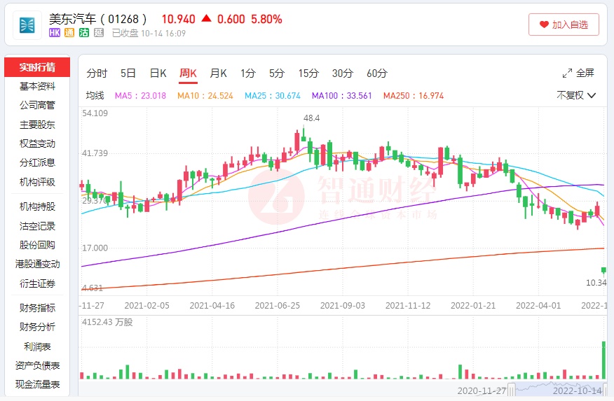 在这其中,低迷了许久的汽车经销商概念股美东汽车(01268)也凭借着强劲的反弹走势引人侧目:从盘面上来看,早盘美东汽车大幅拉升,盘中一度涨超8%领涨板块,随后涨幅有所收窄,收涨5.8%,报于10.94港元。而更早之前,该股还于10月5日强势上涨,录得超11%的涨幅。