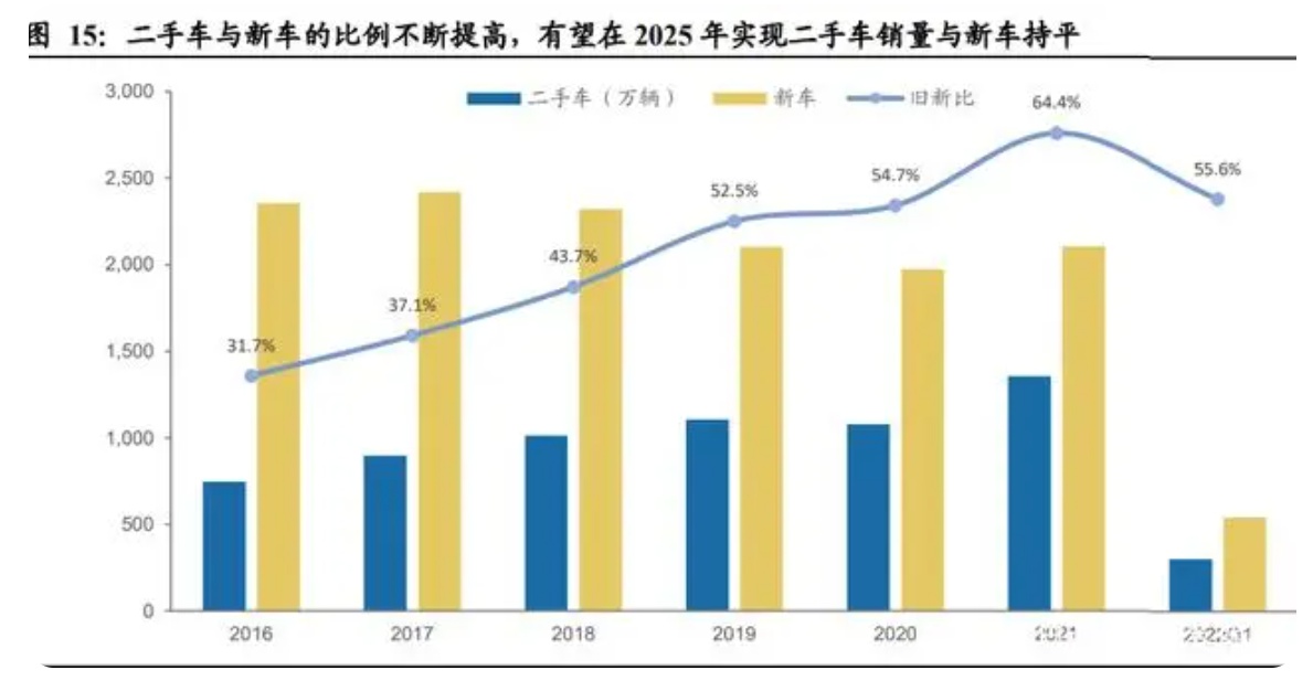 另外,不断解绑的外在政策,也进一步促使二手车交易量攀升。据了解,近年来,政府不断出台利好政策完善二手车发展环境,譬如在2020年出台减税政策,税率从 2%降至 0.5%,对对经销商的盈利空间形成一定利好,而除了税改,政府还在推行全面取消二手车限迁政策、限购城市设置小客车周转指标等重 要政策。至此,东北证券乐观预计,至2025年,二手车销量有望与新车销量持平,达到 2000 万辆规模。