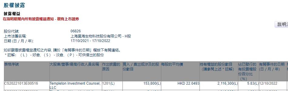 智通财经APP获悉,香港联交所最新资料显示,10月12日,Templeton Investment Counsel, LLC减持昊海生物科技(06826)15.38万股,每股作价22.0493港元,总金额约为339.12万港元。减持后最新持股数目为211.63万股,最新持股比例为5.83%。