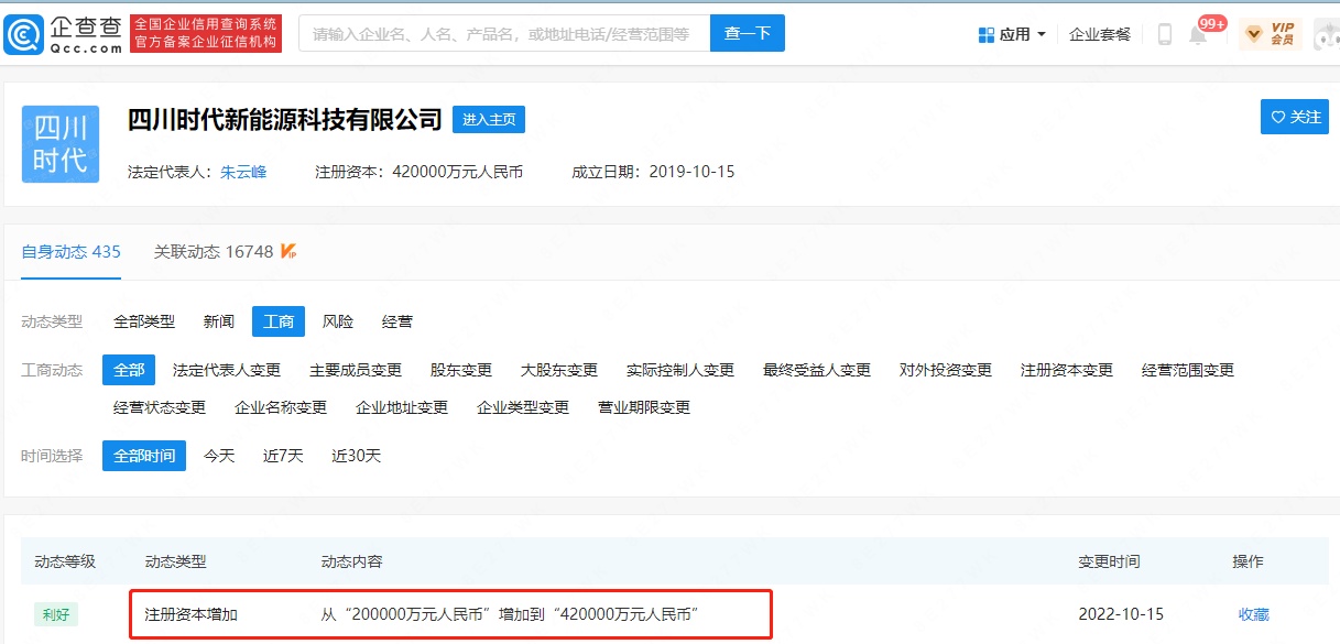 智通财经APP获悉,企查查APP显示,近日,四川时代新能源科技有限公司(下称:时代新能源)发生工商变更,注册资本由20亿人民币增至42亿人民币,增幅110%。
