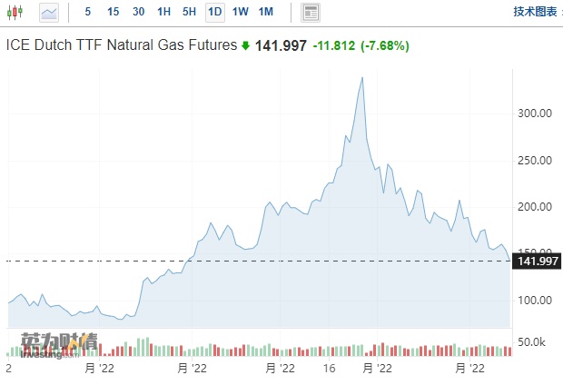 截至发稿,欧洲基准荷兰近月天然气价格下跌7.68%,至每兆瓦时141.997欧元。