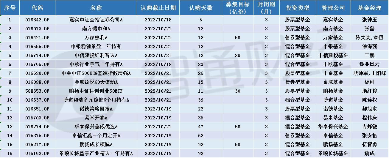 随着上周“爆款”基金的出现,新发基金的表现再次引起人们的注意。本周(10月17日-10月23日)将有16只基金截至认购。其中,13只基金为权益型基金(股票型+混合型)。