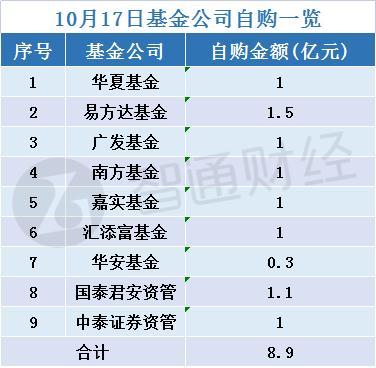 10月17日,多家公募基金宣布自购。华夏、易方达、广发、南方、嘉实、汇添富等9家公募基金、券商资管拿出8.9亿元自购旗下基金。