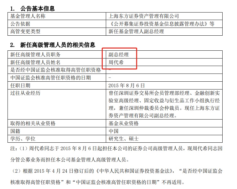 智通财经APP获悉,“换帅”不到一周,10月17日,上海东方证券资产管理有限公司(东方证券资管)再发布基金行业高级管理人员变更公告,任命周代希为副总经理。