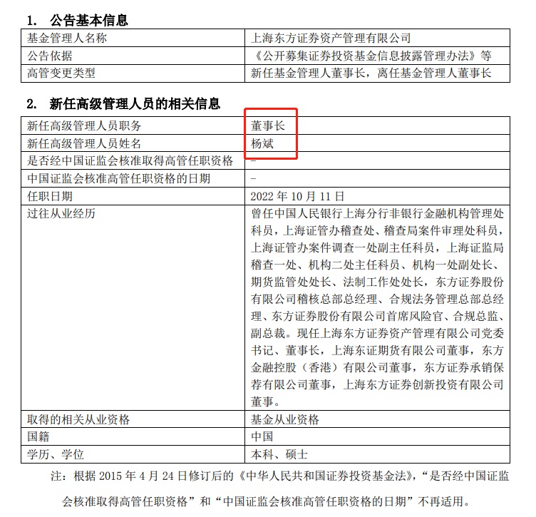 10月12日,东方证券资管发布公告表示,因工作安排,宋雪枫离任董事长职务,同时,公司新任杨斌为公司董事长。