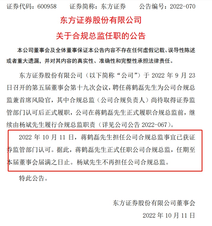 此前,10月11日,东方证券也公告,蒋鹤磊担任公司合规总监事宜已获证券监管部门认可。据此,蒋鹤磊正式任职公司合规总监,任期至本届董事会届满之日止,杨斌不再担任公司合规总监。